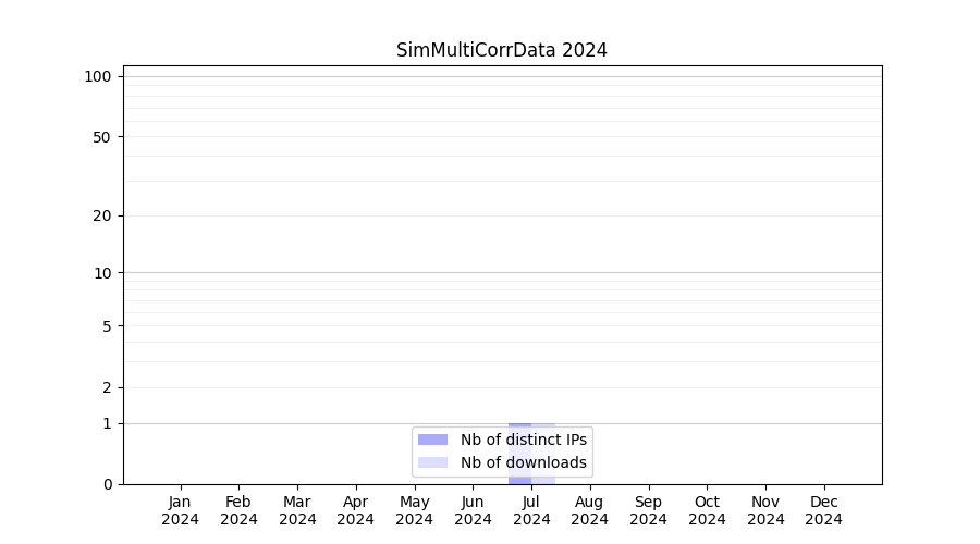 Number of downloads for experiment package SimMultiCorrData, year by year, from 2025 back to 2014 (years with no downloads are omitted):