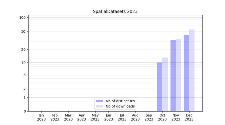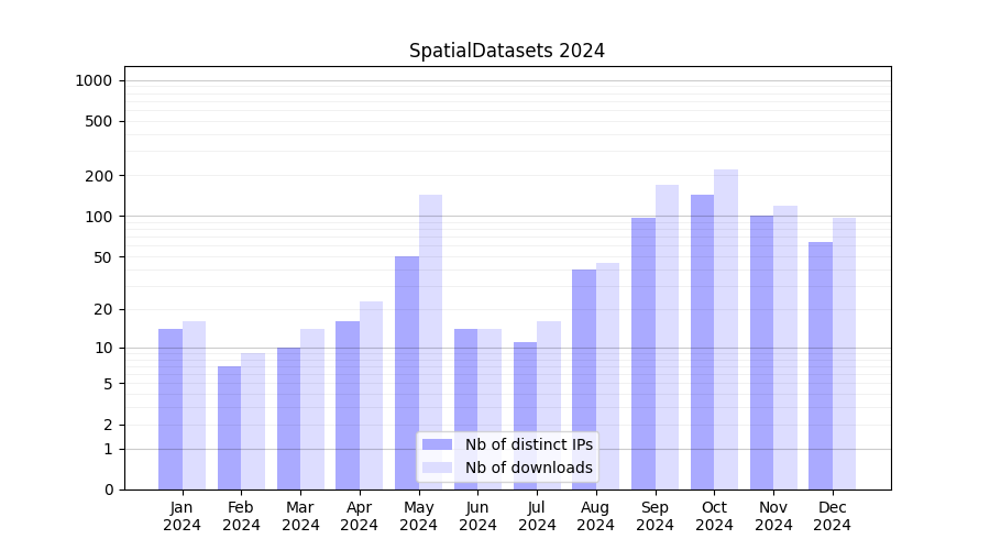 Number of downloads for experiment package SpatialDatasets, year by year, from 2025 back to 2014 (years with no downloads are omitted):
