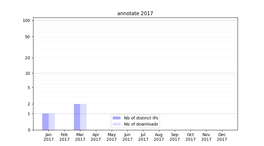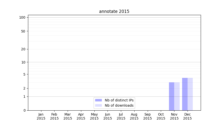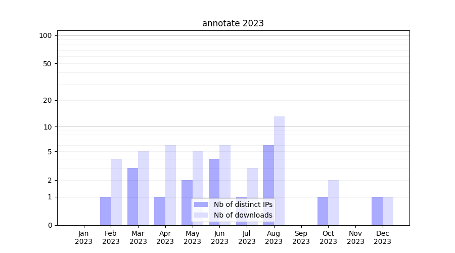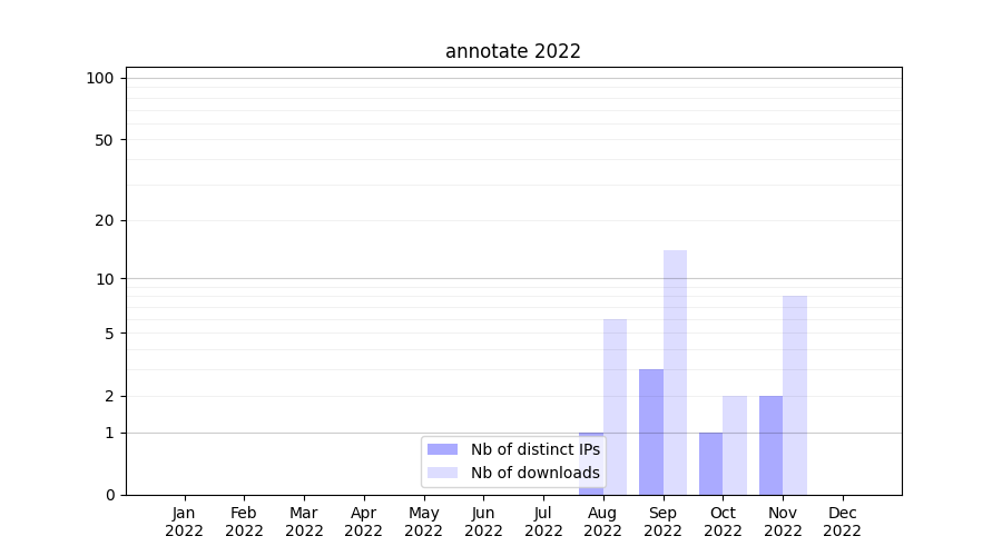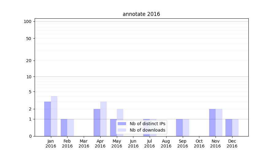 Number of downloads for experiment package annotate, year by year, from 2025 back to 2014 (years with no downloads are omitted):