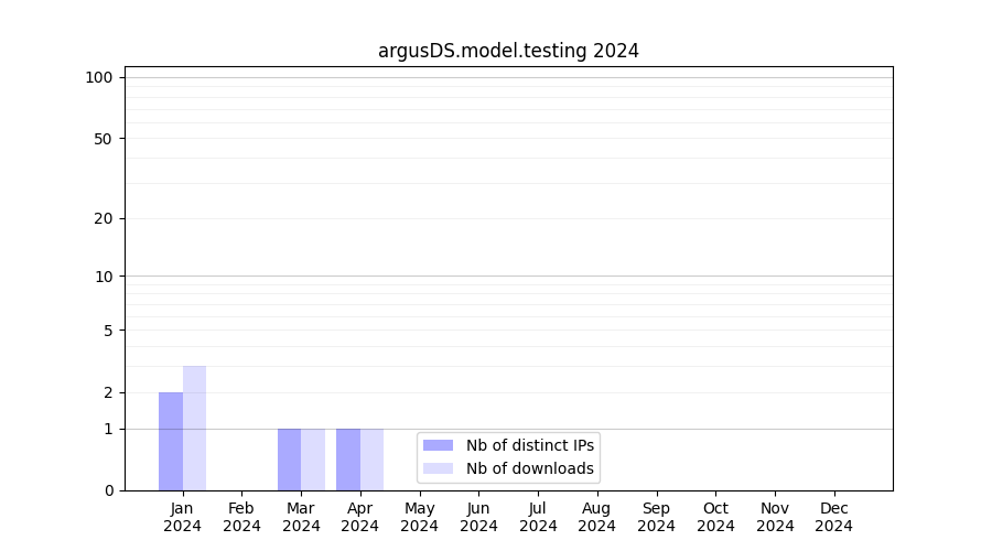 Number of downloads for experiment package argusDS.model.testing, year by year, from 2025 back to 2014 (years with no downloads are omitted):