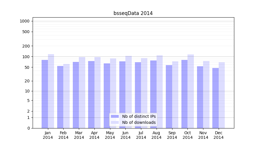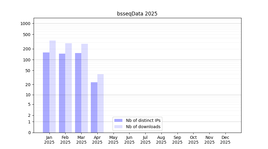 Number of downloads for experiment package bsseqData, year by year, from 2025 back to 2014 (years with no downloads are omitted):