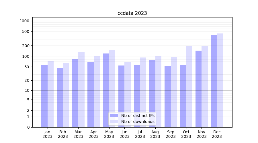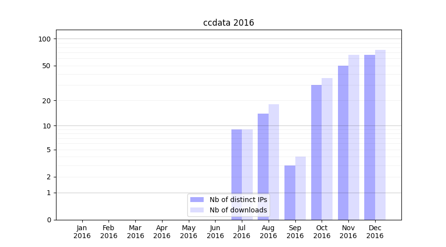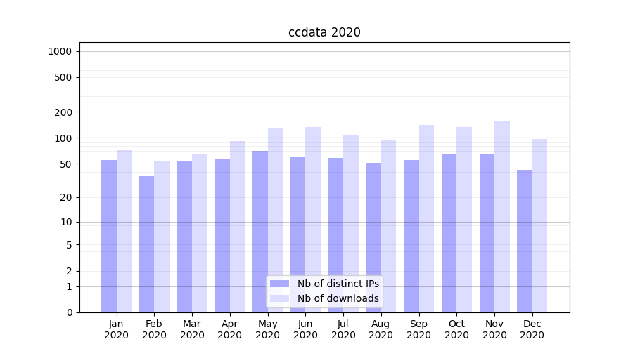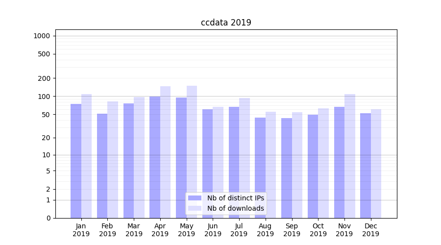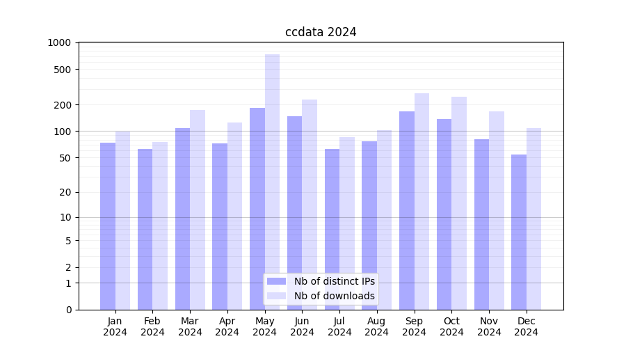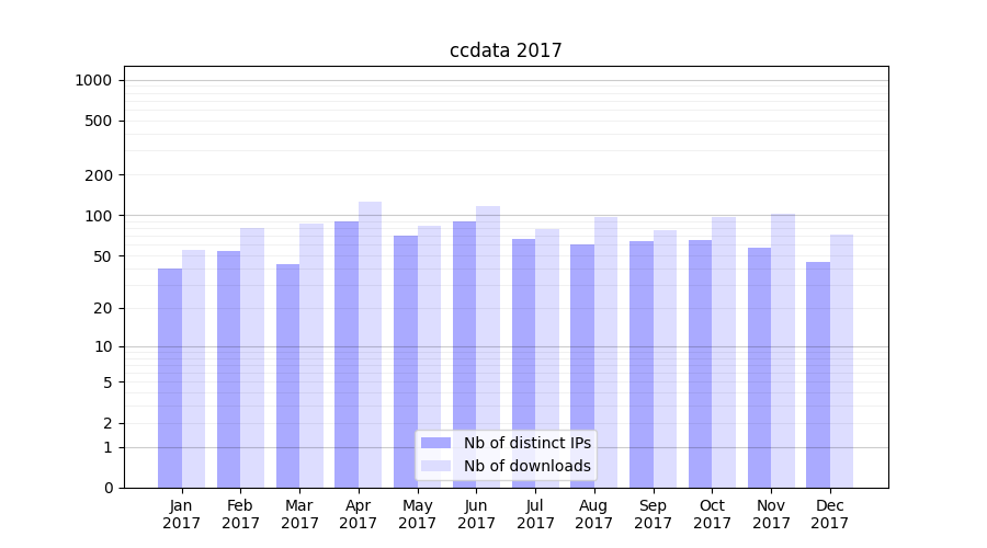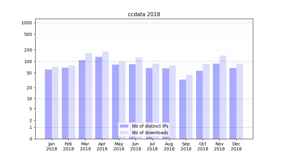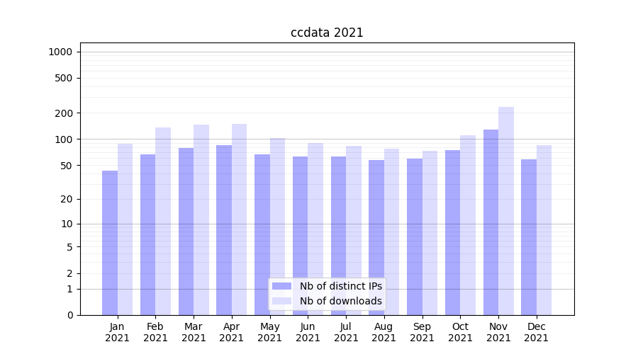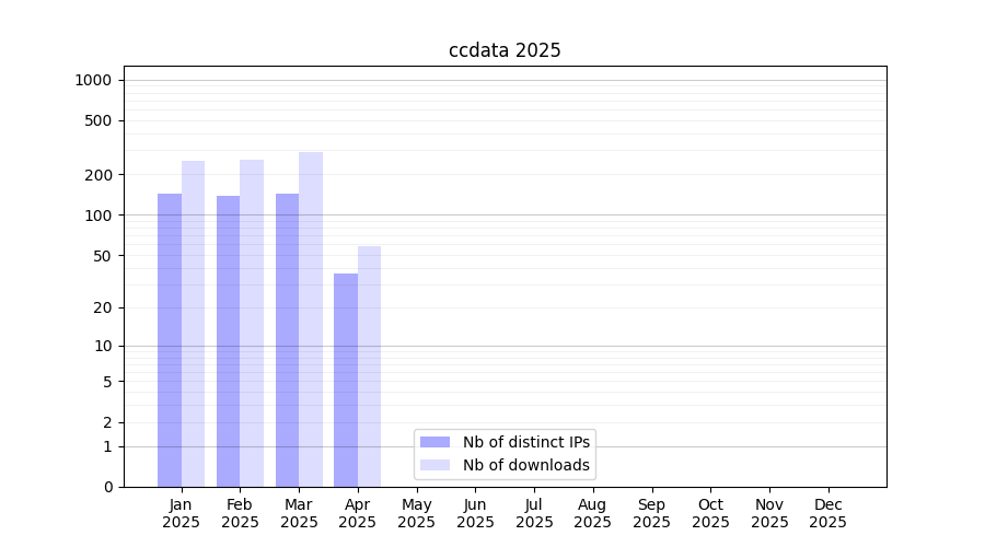 Number of downloads for experiment package ccdata, year by year, from 2025 back to 2014 (years with no downloads are omitted):