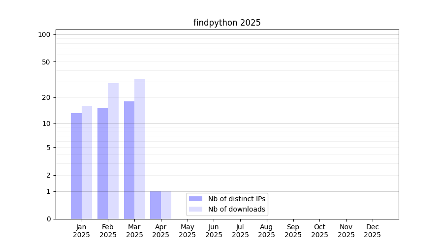 Number of downloads for experiment package findpython, year by year, from 2025 back to 2014 (years with no downloads are omitted):