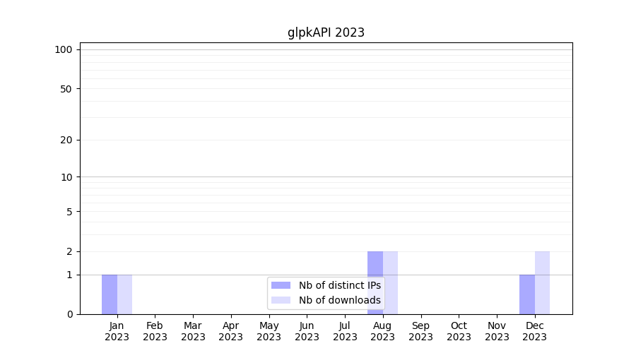 Number of downloads for experiment package glpkAPI, year by year, from 2025 back to 2014 (years with no downloads are omitted):