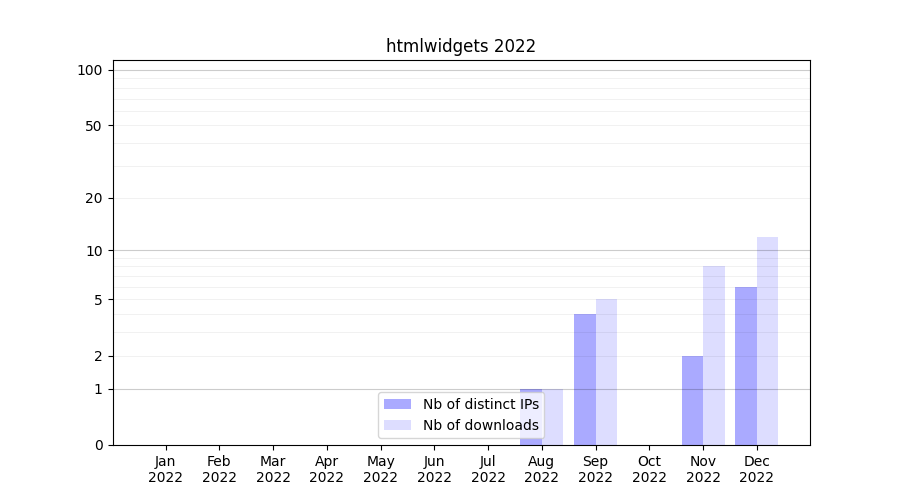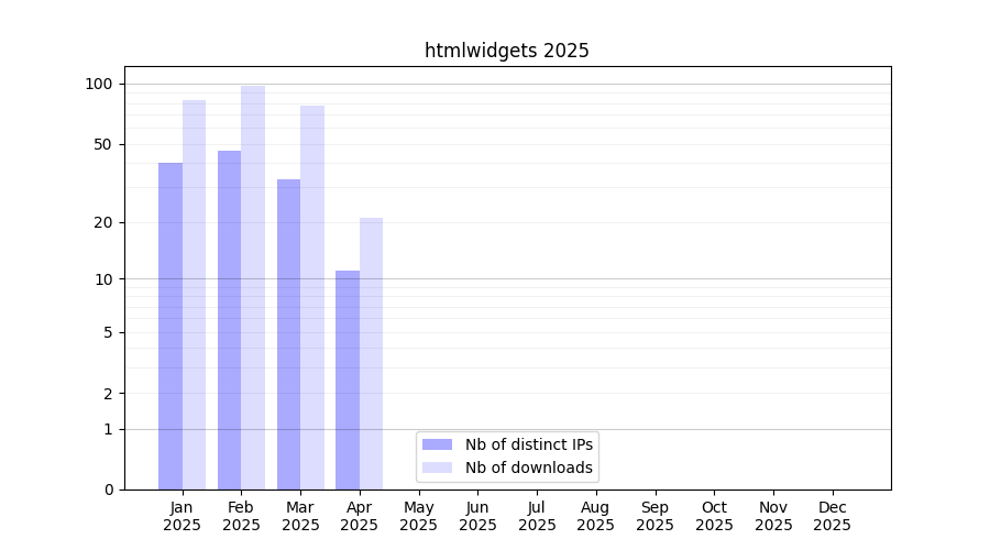 Number of downloads for experiment package htmlwidgets, year by year, from 2025 back to 2014 (years with no downloads are omitted):