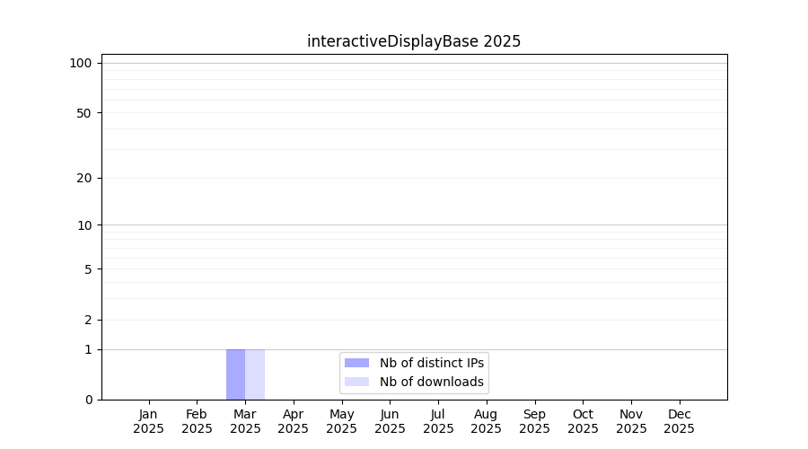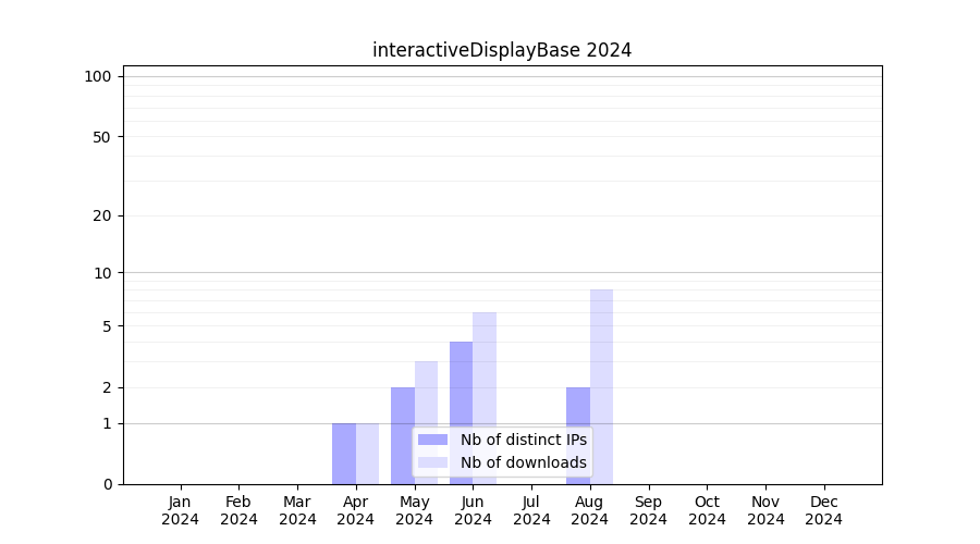 Number of downloads for experiment package interactiveDisplayBase, year by year, from 2025 back to 2014 (years with no downloads are omitted):