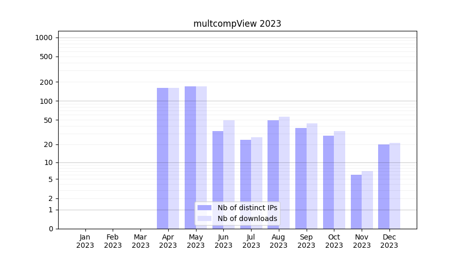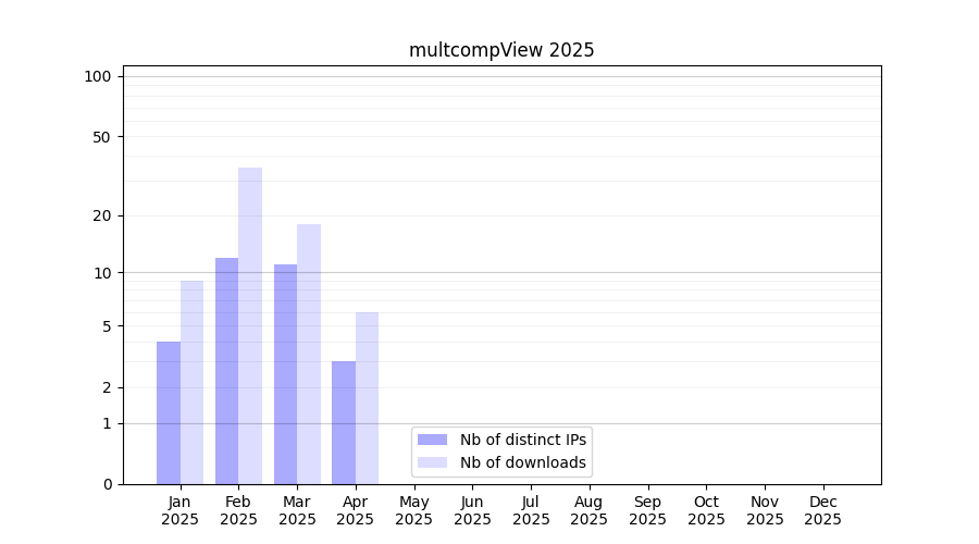 Number of downloads for experiment package multcompView, year by year, from 2025 back to 2014 (years with no downloads are omitted):