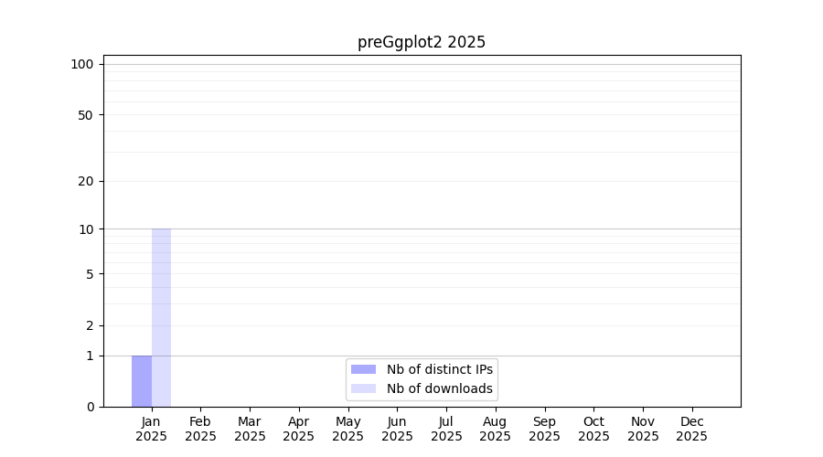 Number of downloads for experiment package preGgplot2, year by year, from 2025 back to 2014 (years with no downloads are omitted):