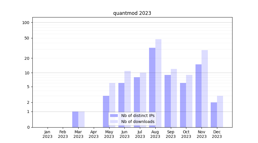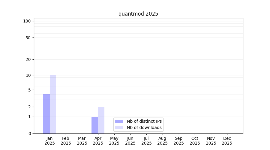 Number of downloads for experiment package quantmod, year by year, from 2025 back to 2014 (years with no downloads are omitted):