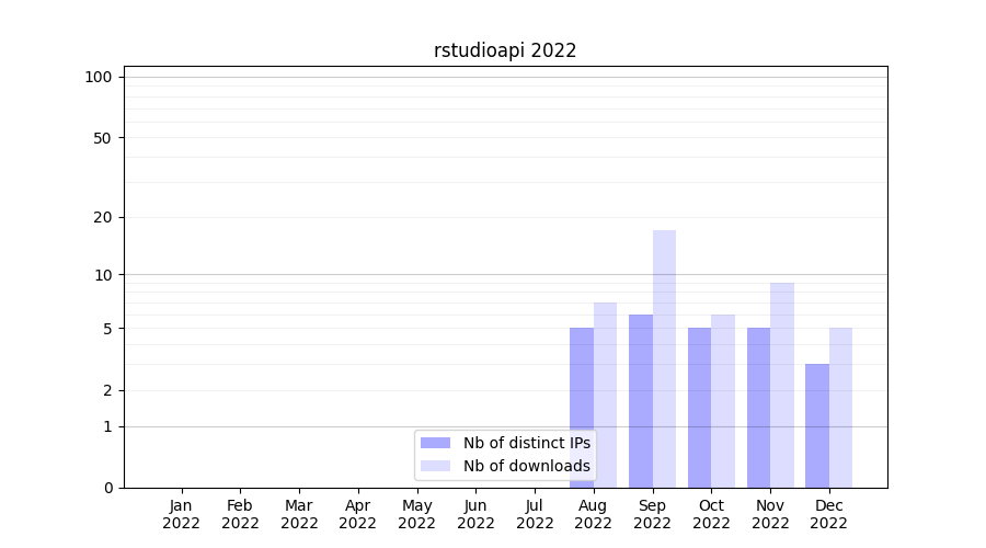 Number of downloads for experiment package rstudioapi, year by year, from 2025 back to 2014 (years with no downloads are omitted):