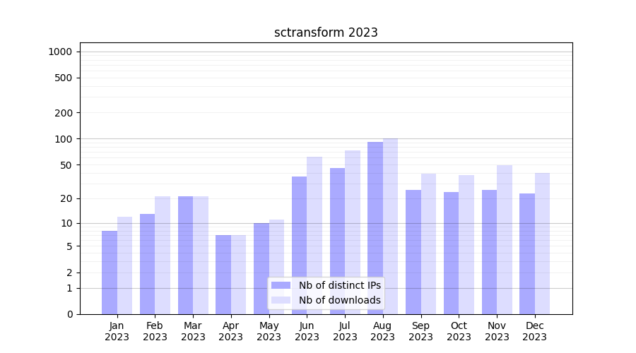 Number of downloads for experiment package sctransform, year by year, from 2025 back to 2014 (years with no downloads are omitted):