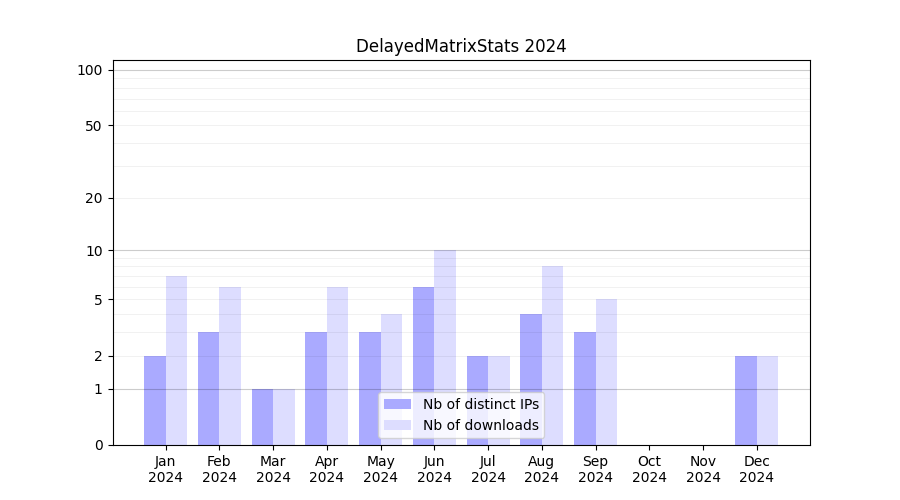 Number of downloads for workflow package DelayedMatrixStats, year by year, from 2025 back to 2015 (years with no downloads are omitted):
