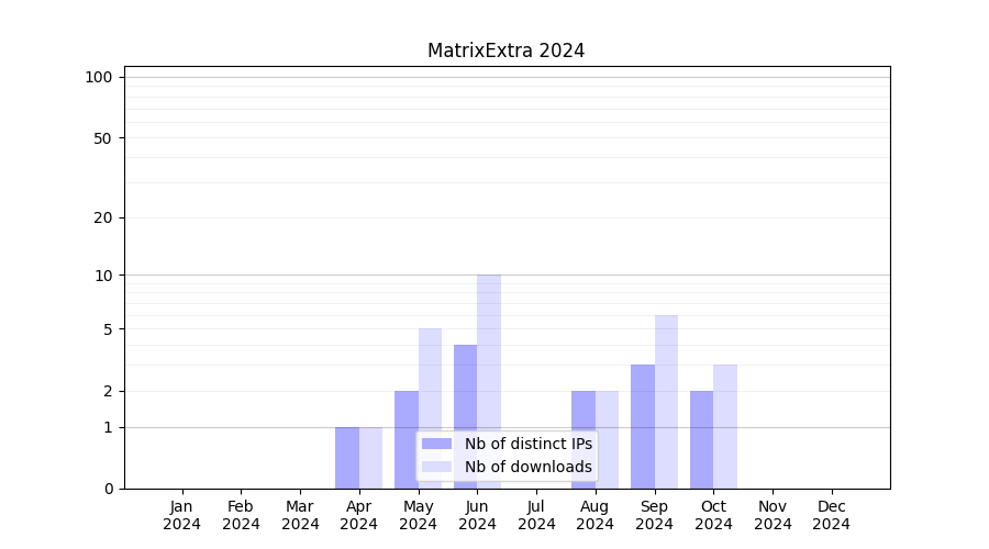 Number of downloads for workflow package MatrixExtra, year by year, from 2025 back to 2015 (years with no downloads are omitted):