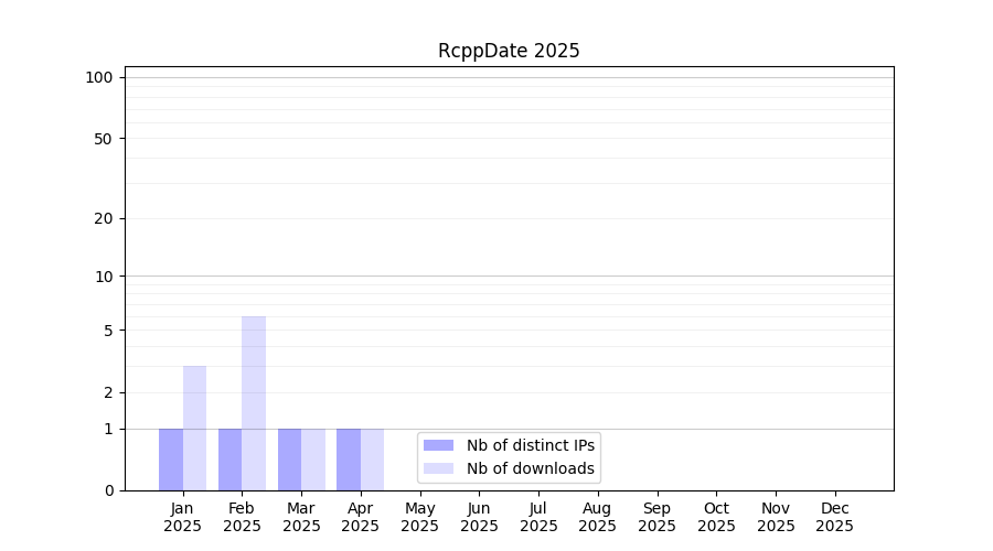 Number of downloads for workflow package RcppDate, year by year, from 2025 back to 2015 (years with no downloads are omitted):
