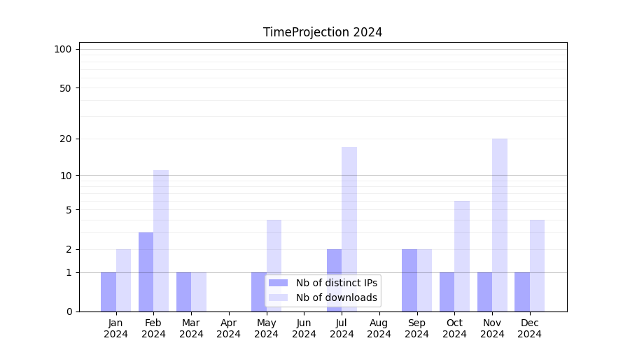 Number of downloads for workflow package TimeProjection, year by year, from 2025 back to 2015 (years with no downloads are omitted):