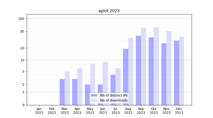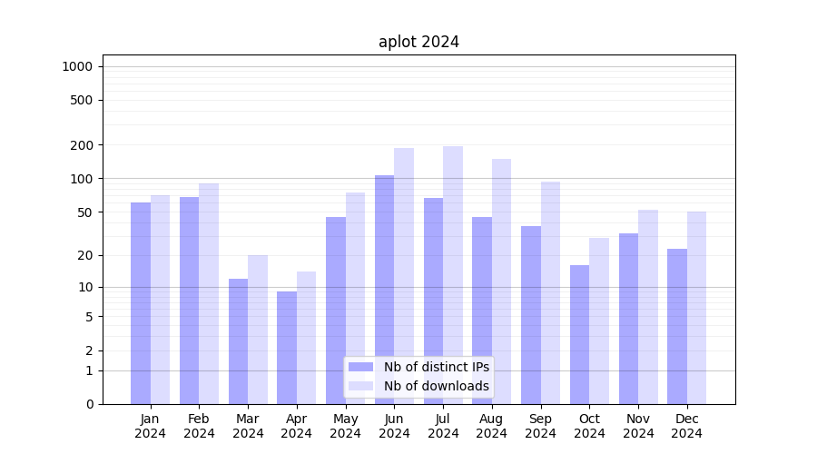 Number of downloads for workflow package aplot, year by year, from 2025 back to 2015 (years with no downloads are omitted):