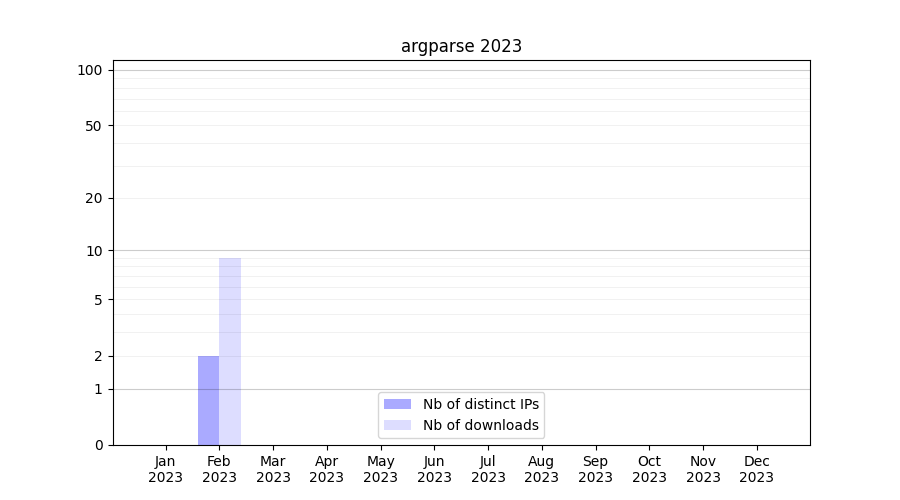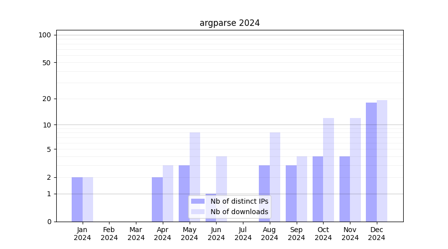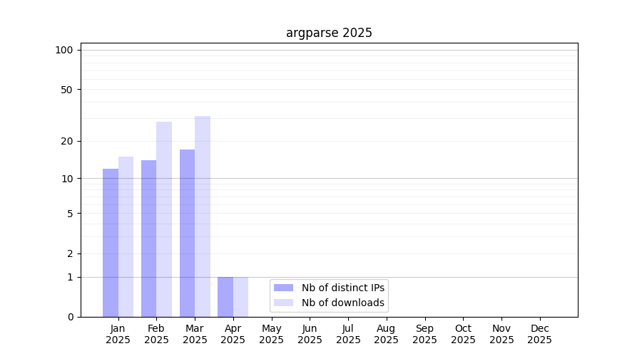 Number of downloads for workflow package argparse, year by year, from 2025 back to 2015 (years with no downloads are omitted):