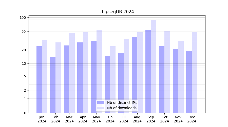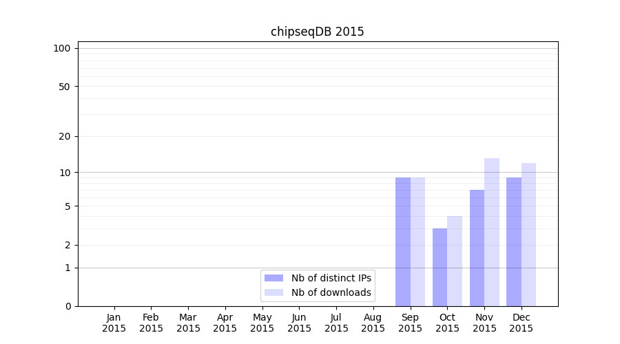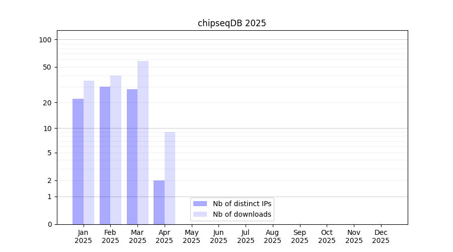 Number of downloads for workflow package chipseqDB, year by year, from 2025 back to 2015 (years with no downloads are omitted):