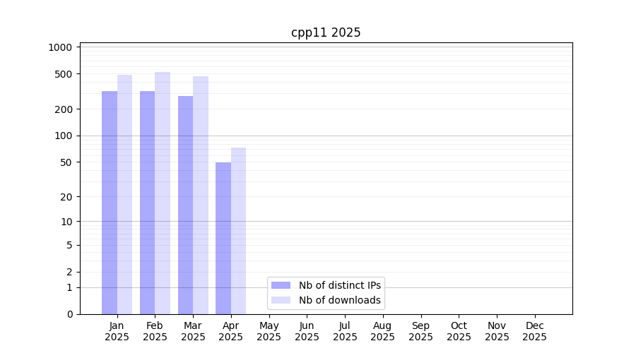 Number of downloads for workflow package cpp11, year by year, from 2025 back to 2015 (years with no downloads are omitted):