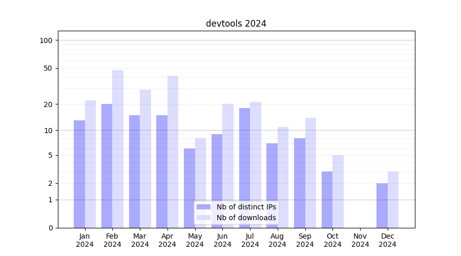 Number of downloads for workflow package devtools, year by year, from 2025 back to 2015 (years with no downloads are omitted):
