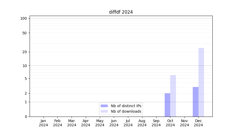 Number of downloads for workflow package diffdf, year by year, from 2025 back to 2015 (years with no downloads are omitted):
