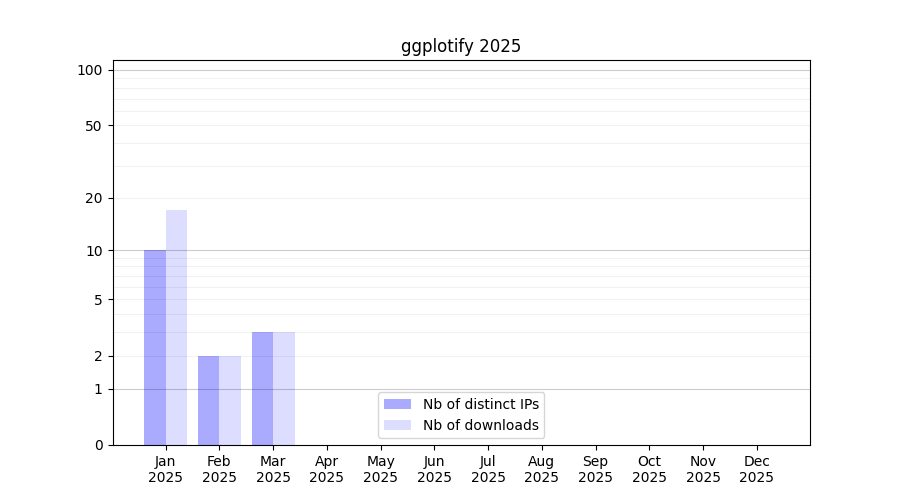 Number of downloads for workflow package ggplotify, year by year, from 2025 back to 2015 (years with no downloads are omitted):