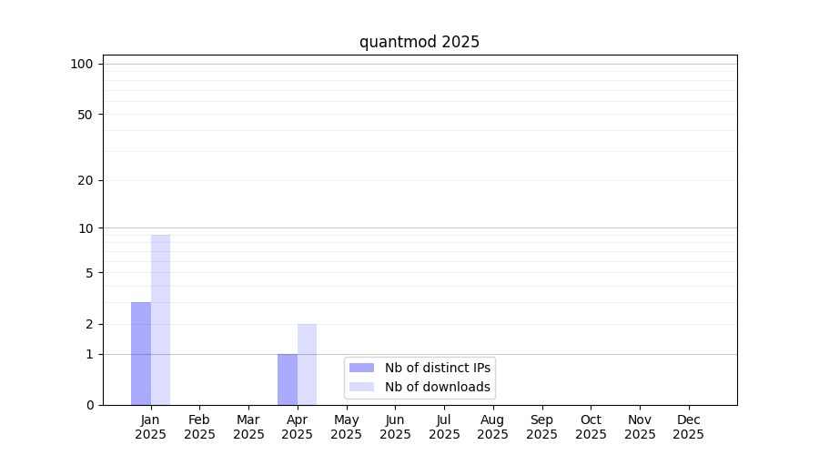 Number of downloads for workflow package quantmod, year by year, from 2025 back to 2015 (years with no downloads are omitted):